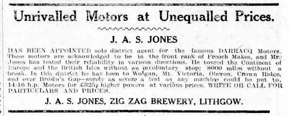 ESTABLISHED IN BREWERS GULLY OAKLEY PARK IN 1884, THE ZIG ZAG BREWERY WAS ACQUIRED BY JOHN STAMMERS JONES IN 1896. WAS SOLD TO LITHGOW BREWERY 1928.