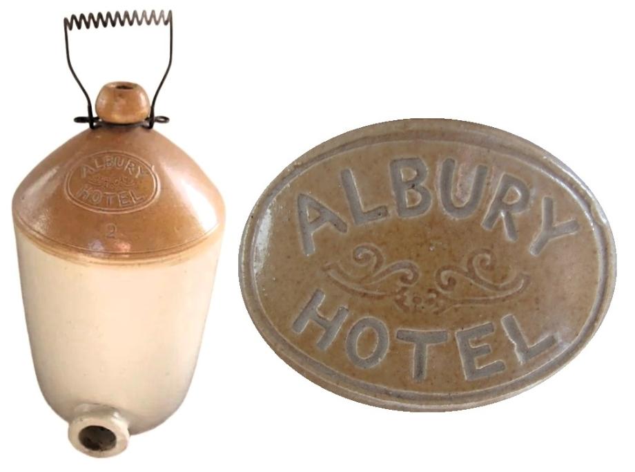 POTTERY STONEWARE JAR JUG DEMIJOHN FLAGON BOTTLECharles Schmiedt was granted the licence for the Albury Hotel at 595 Dean Street Albury in October 1873. A new hotel was built by Schmiedt at 579 Dean Street, it opened in November 1876, having taken the name from the 595 address, which then became Tattersall's Hotel. By 1915 the Albury Hotel was run by licensee L C Harper, then taken over by Richmond Breweries in 1935. The Albury Hotel ceased trading on 30 June 1939, the next day the New Albury Hotel opened in Kiewa Street Albury.