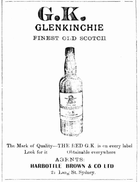 ADVERTISEMENT FOR OLD VATTED GLENKICHIE SCOTCH WHISKY HARBOTTLE BROWN & CO 21 LANG STREET SYDNEY FROM THE GRENFELL RECORD 31 DECEMBER 1925