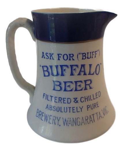 ASK FOR ( "BUFF" ) BUFFALO BEER FILTERED & CHILLED ABSOLUTELY PURE BREWERY WANGARATTA VIC ADVERTISING JUG OR PITCHER